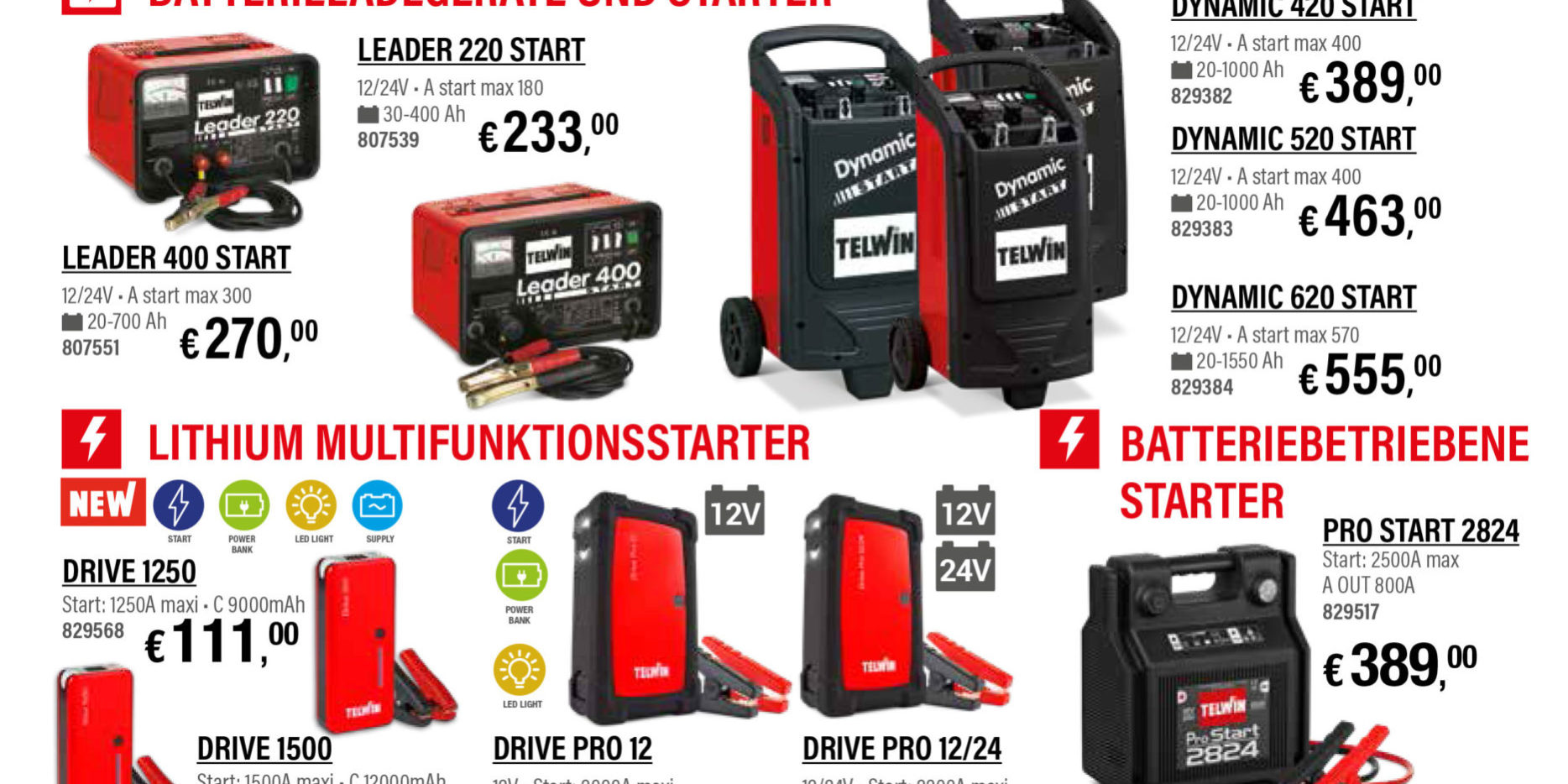 Der Hersteller Telwin hält für Sie wieder tolle Aktionen bereit. Und zwar Kfz Ladegeräte, Starthilfe, Jump Starter, Power Bank. Neueste Technologien und einfache Bedienung zeichnen die Batterieladegeräte und Starter aus.